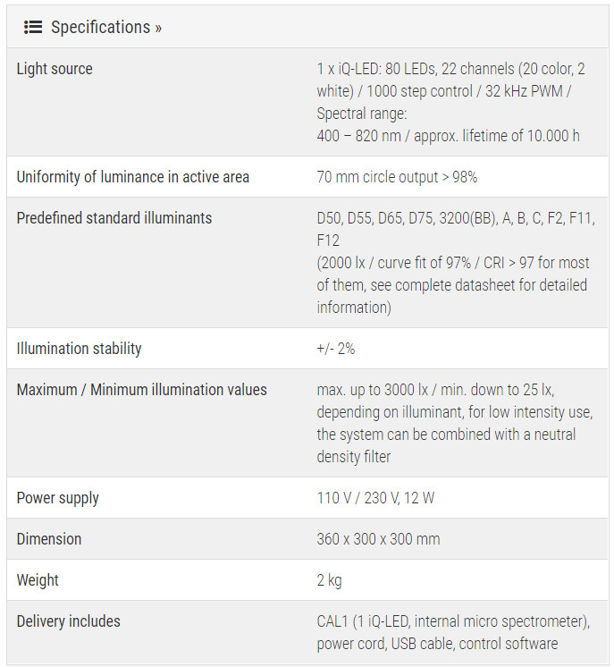 CAL1 은 70mm 발광부를 조사하도록 설계된 30cm 적분 구에 하나의 iQ-LED module 로 구성된 컴팩트 한 디자인을 갖추고 있습니다.
