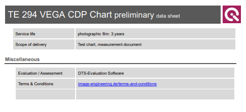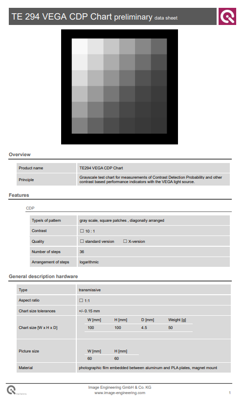 TE294 Greyscale chart for Vega 는 자동차 카메라 시스템의 성능을 평가하는 데 사용되는 것과 같은 고정밀 측정을 위한 고유한 그레이스케일 테스트 차트입니다.
