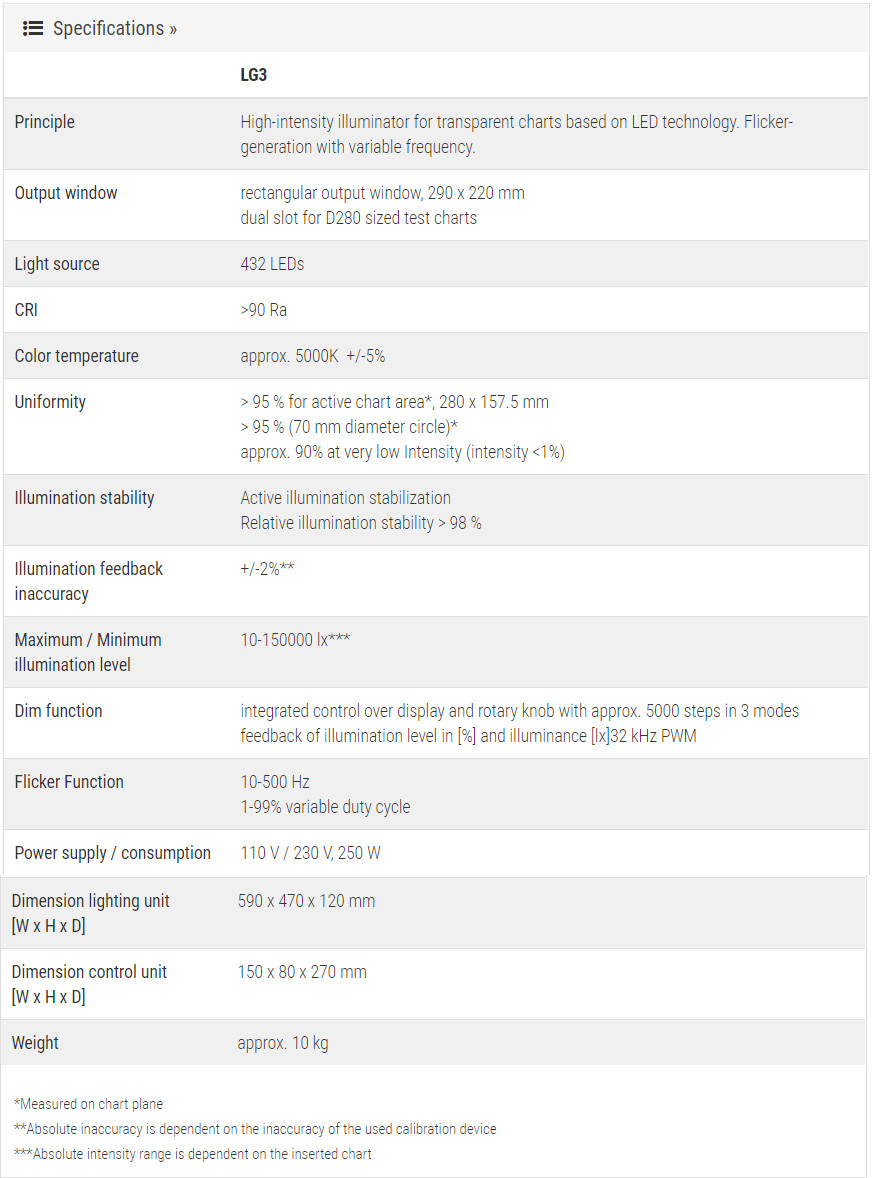 LG3 는 150,000 lx 이상의 높은 광량으로 high contrast test target 을 조사 할 수 있습니다.