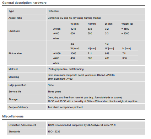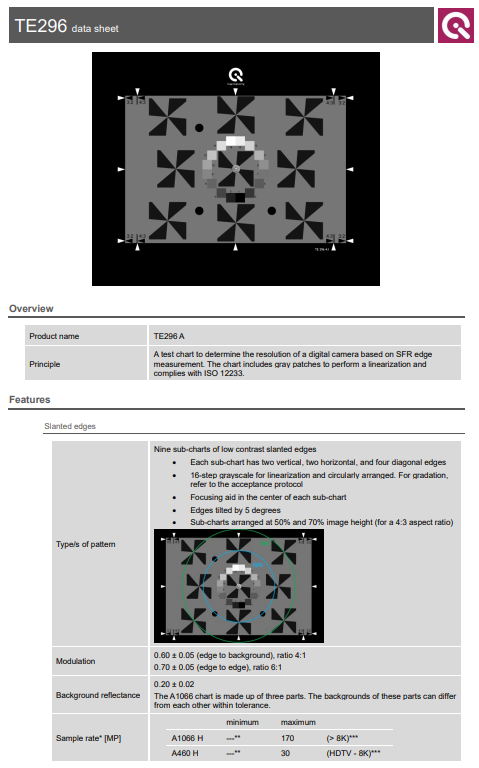TE296 SFR edge chart는 SFR edge 측정을 기반으로 디지털 카메라의 해상도를 측정합니다.