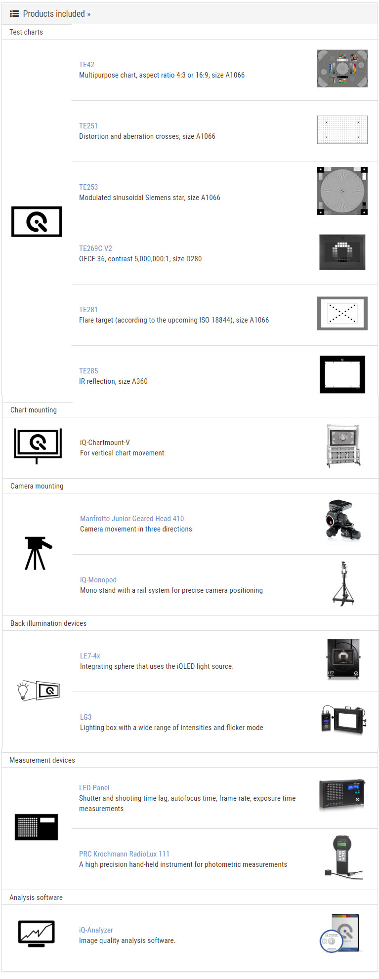 이 솔루션은 또한 최고의 조명 및 노출 측정, 장치의 최적화, 차트, 카메라 및 입증 된 iQ-Analyzer 분석 소프트웨어를 포함합니다.