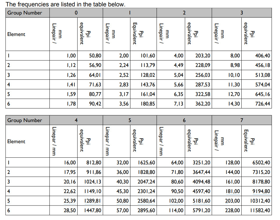 35mm 필름의 USAF 해상도 테스트 차트는 최대 10.000ppi의 스캐너 해상도에 사용할 수 있습니다.