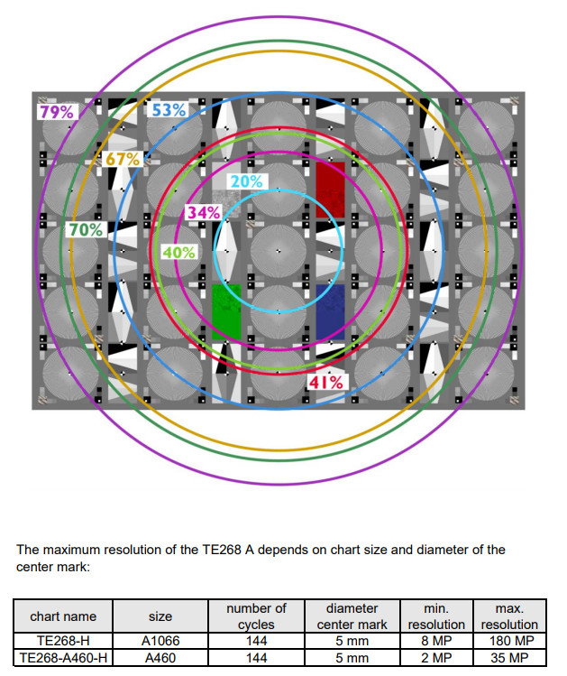 TE268 Lens Resolution Test Chart 는 렌즈의 해상도와 선명도 측정을 위해 설계되었습니다.