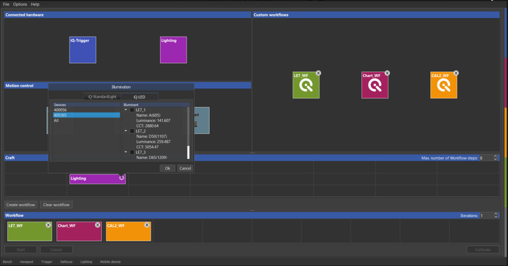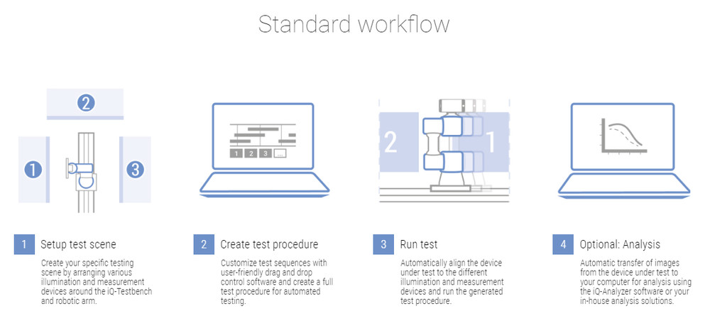 이 솔루션의 중심에는 iQ-Automator 소프트웨어가 있습니다. 기본적으로 이 소프트웨어는 사용자가 정의하고 생성한 작업 과정에 따라 DUT (Device Under Test) 를 조명 및 측정 장치에 자동으로 맞출 수 있습니다.