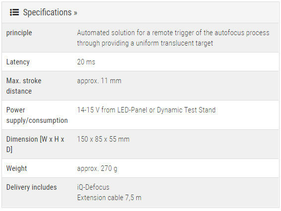 AF 기능만 있는 카메라의 AF time 측정을 위해서는 defocus 후 다시 Focusing 되는 시간을 측정해야 하며, 이런 작업 과정에서 iQ-Defocus 를 사용할 수 있습니다.