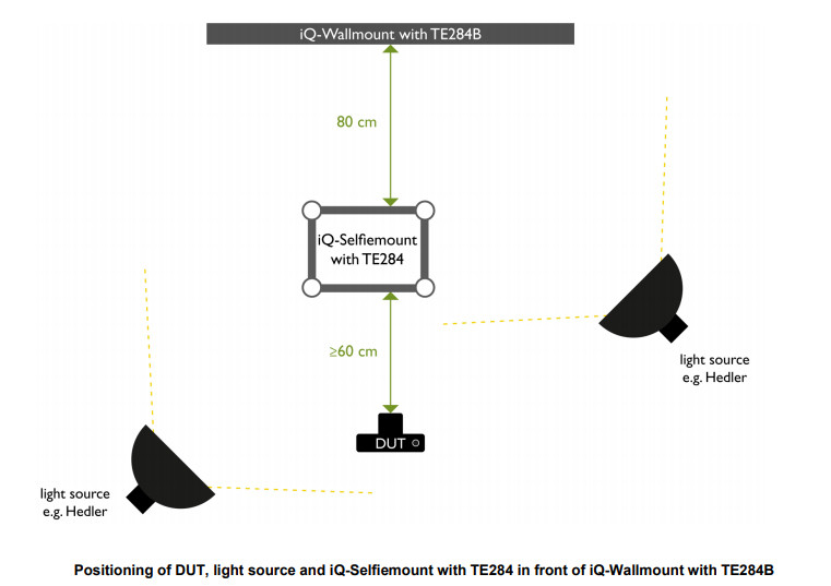 전경 차트 (TE284)는 마네킹 헤드와 함께 iQ-Selfiemount 위에 배치되며 배경 차트 (TE284B)는 iQ- walmount 에 장착되고 iQ-Selfiemount 의 배경으로 80cm 이격시켜 배치됩니다.