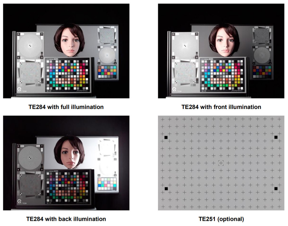 iQ-Selfie Studio 의 중심에는 두 개의 TE284 테스트 차트와 검은 머리의 마네킹 머리가 있습니다.